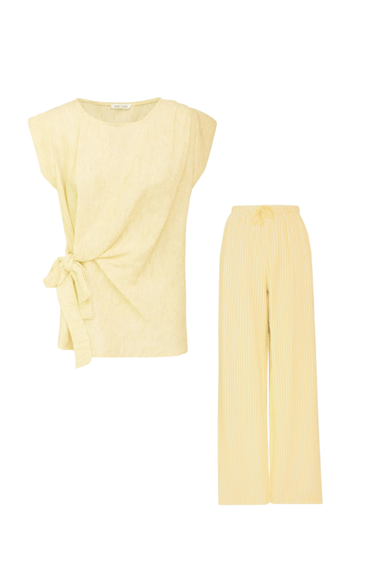 De top heeft een flatterende strik aan de zijkant en valt mooi losjes. De broek is high comfort dankzij de elastische taille, en heeft steekzakken voor die “ik heb alles bij me”-vibe 😄