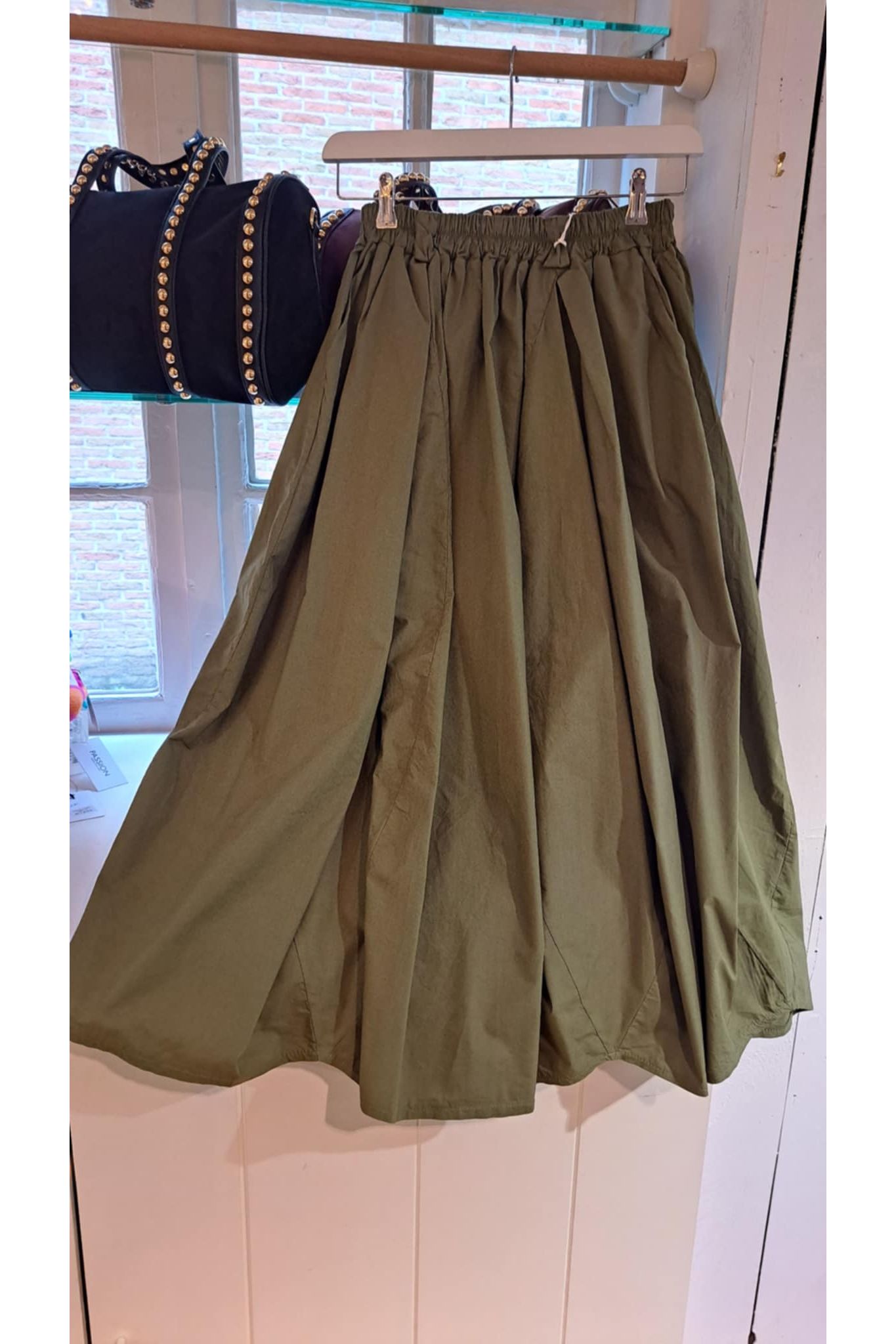 Deze unieke rok heeft een ballonmodel dat zorgt voor een speels, volumineus silhouet. Door de extra stroken stof die langs beide zijden zijn ingezet, valt de rok mooi rond het lichaam en creëert ze haar typische, zachte ballonvorm.