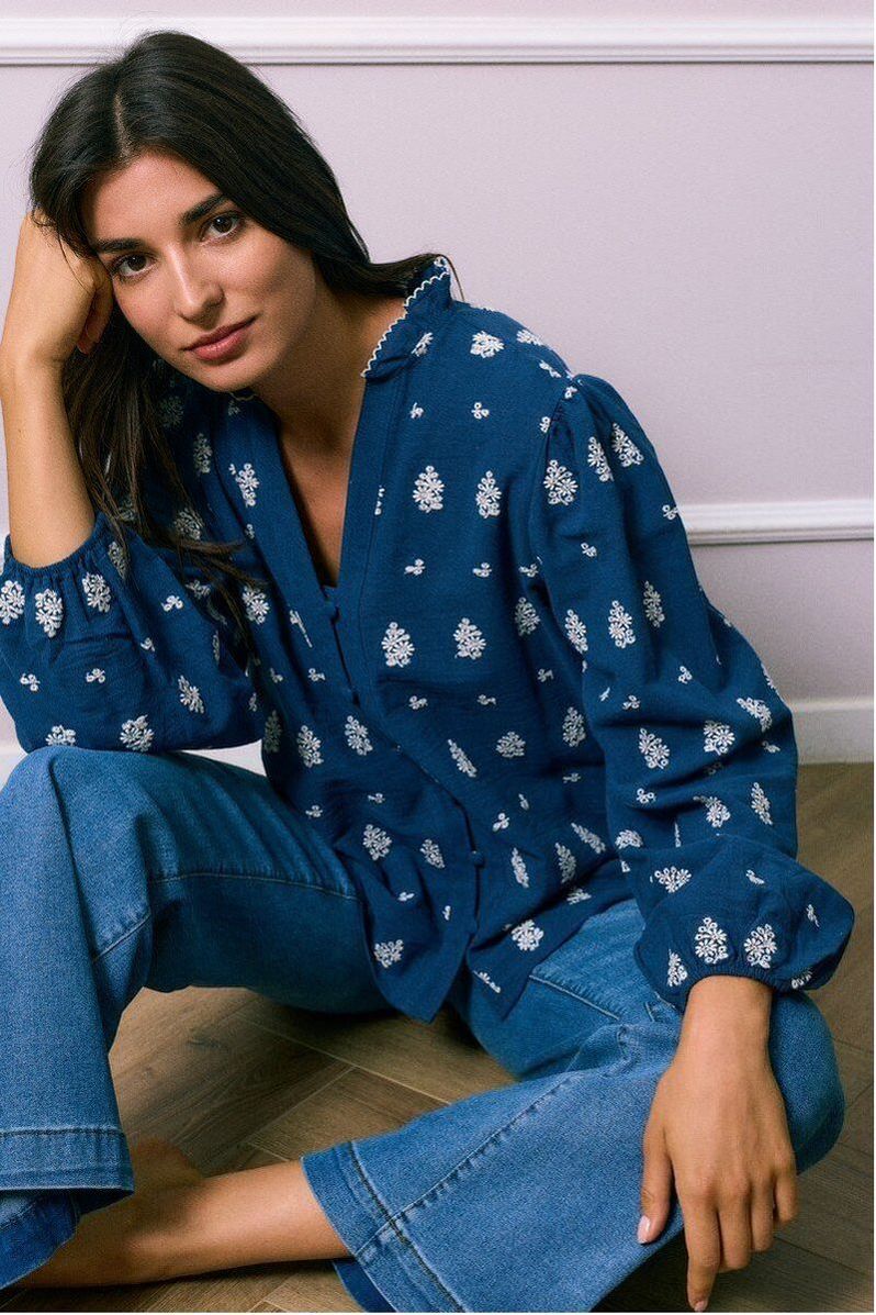 Fris, luchtig en bohemian chic: deze blauwe blouse met wit geborduurd motief is een echte must-have voor je garderobe. Het losvallende model met lange mouwen en knoopsluiting geeft je een nonchalante maar elegante uitstraling. De subtiel opstaande kraag met fijne afwerking en de ton-sur-ton beklede knoopjes zorgen voor een verfijnd detail.