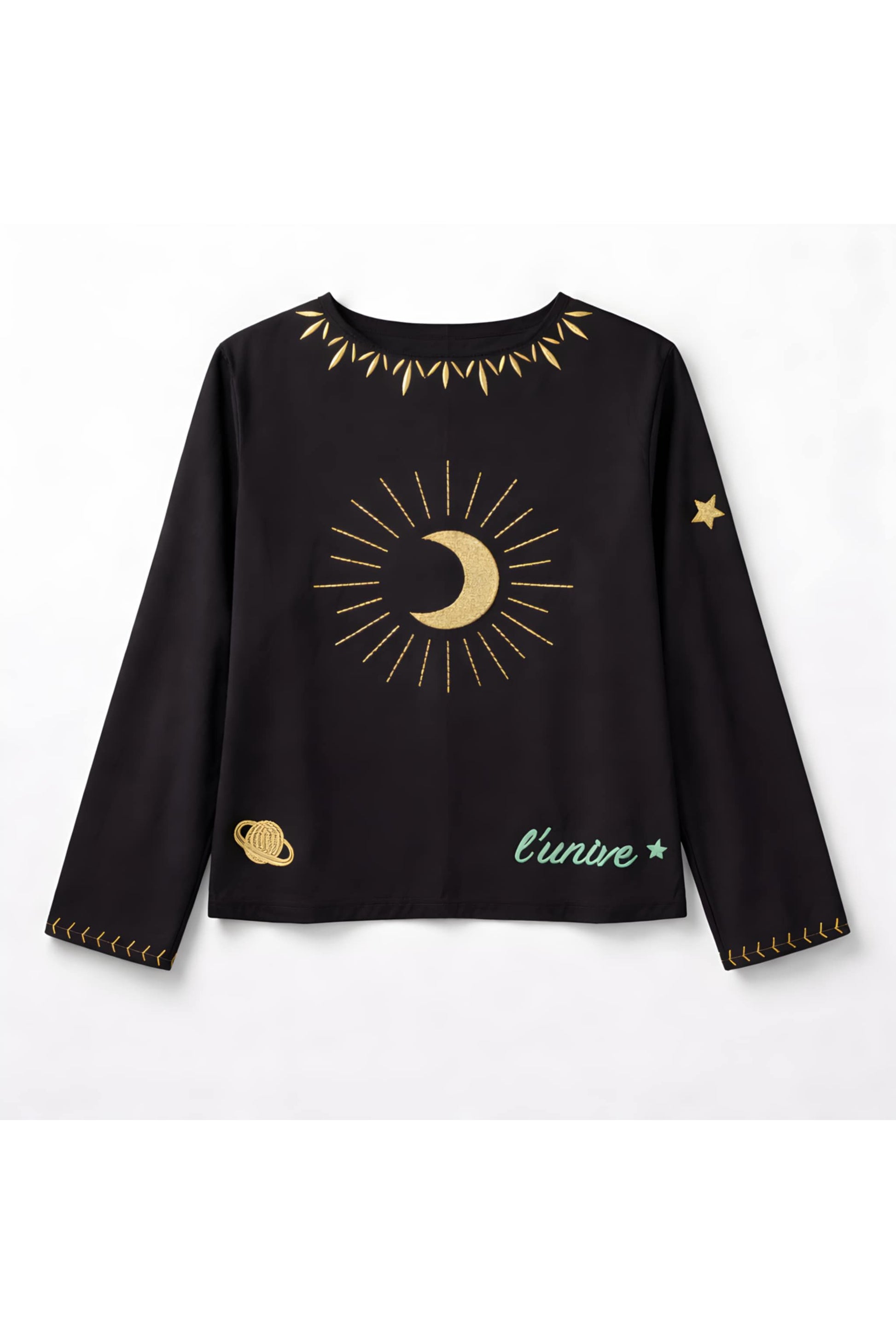 De blouse kan op verschillende manieren gedragen worden: gesloten als blouse of open als jasje of giletje over een top of jurk. Het rijke borduurwerk met symbolen en kleuraccenten maakt van dit stuk een echte blikvanger, zonder aan draagbaarheid in te boeten.