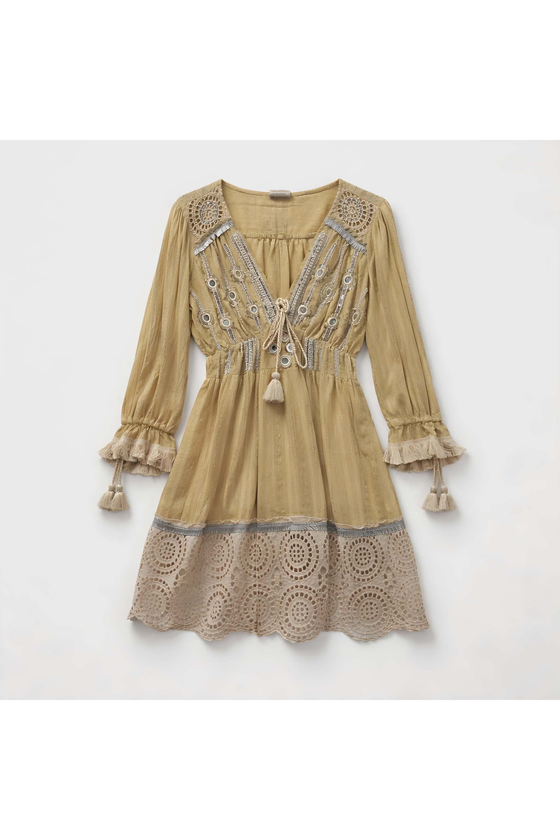 Deze elegante boho jurk is een echte blikvanger dankzij de verfijnde details en zachte, vrouwelijke uitstraling. De subtiele glans in de stof, gecombineerd met de mooie borduursels en spiegelaccenten, geeft de jurk een unieke en luxueuze look.