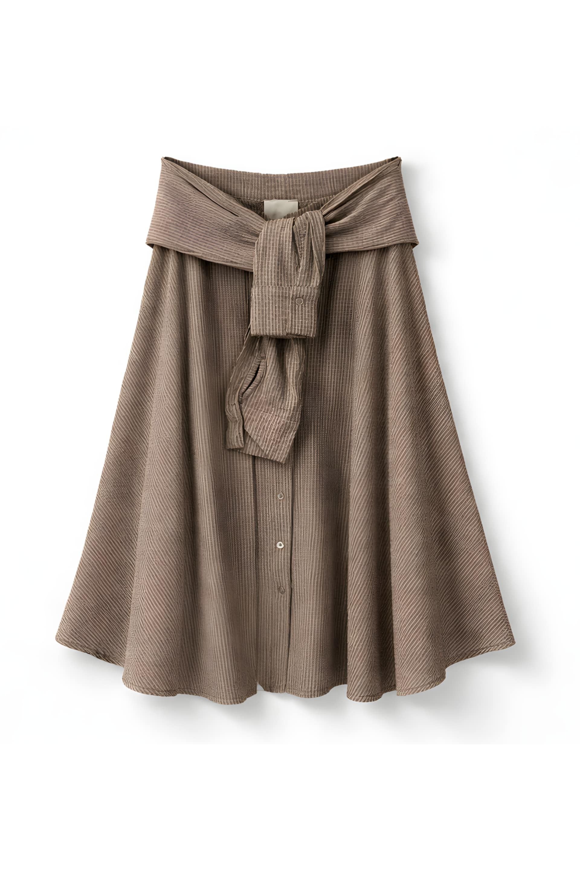 Deze bruine gestreepte maxi rok is een echte eyecatcher met een unieke twist! Het model lijkt alsof je een blouse rond je taille geknoopt hebt, dankzij de vaste mouwen die verwerkt zijn als riemdetail. Super trendy, speels én tegelijkertijd heel stijlvol.
