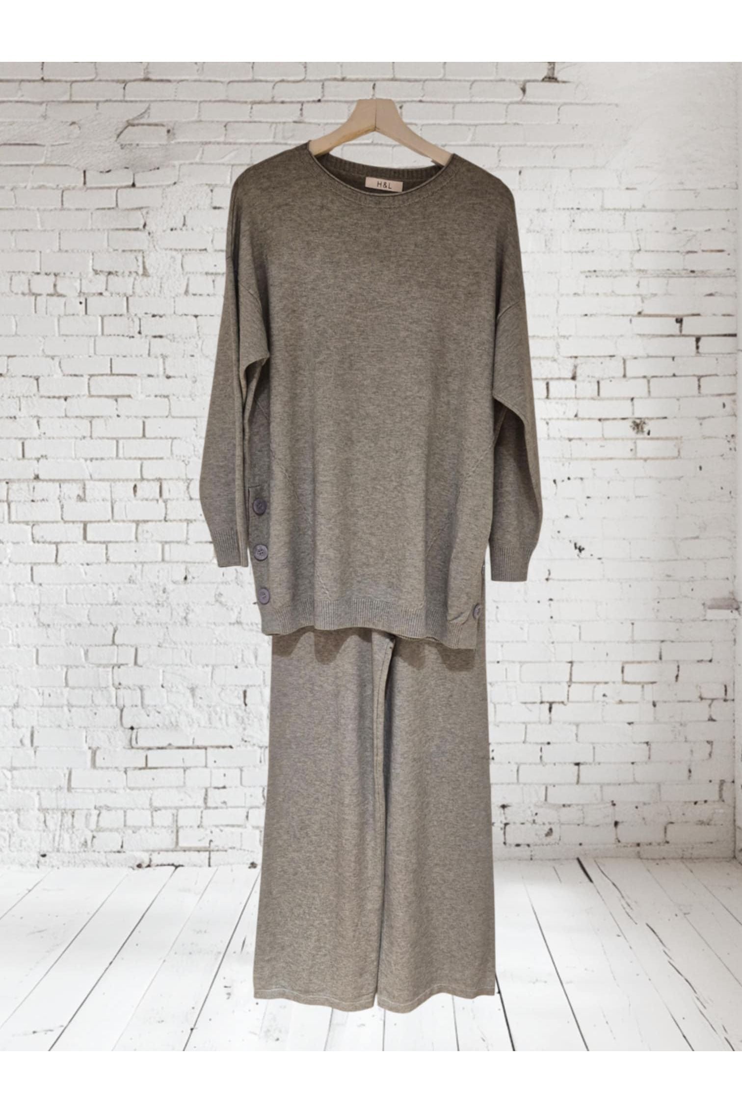 Dit two-piece comfy pak is zo’n outfit die je bijna gênant vaak gaat dragen. Een superzachte knit, een losse wide-leg broek, een nonchalante pull met knoopdetail aan de zijkant… Je bent aangekleed in 5 seconden en ziet er toch instant chic uit. Perfect voor thuis, op de winkelvloer of stylish casual days in Brugge.