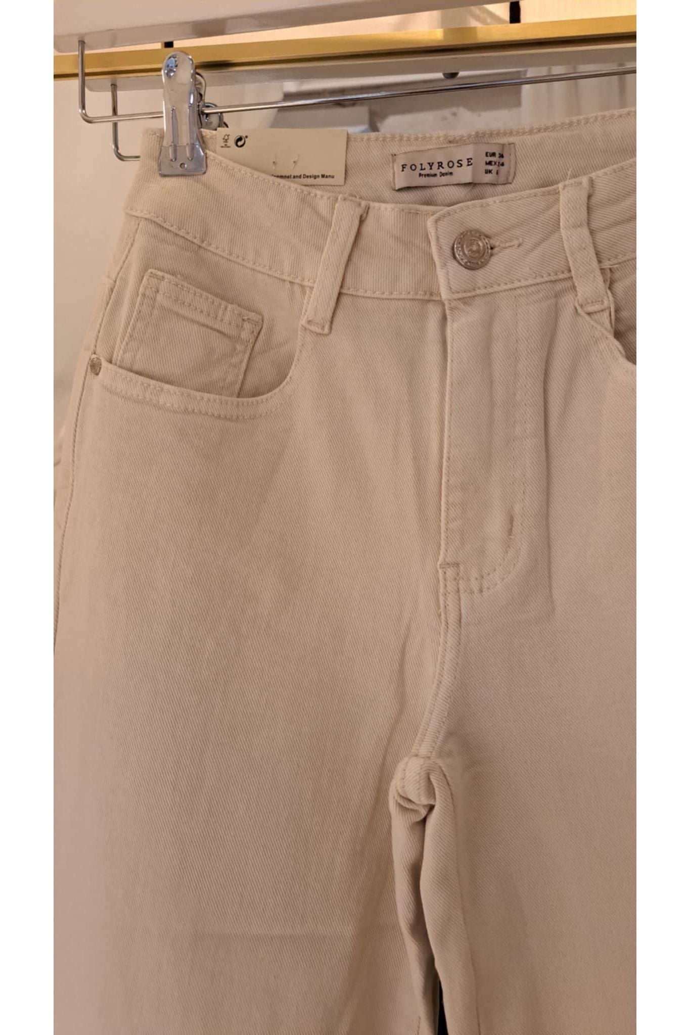 Details: Borduurwerk onderaan de pijpen, rafelafwerking