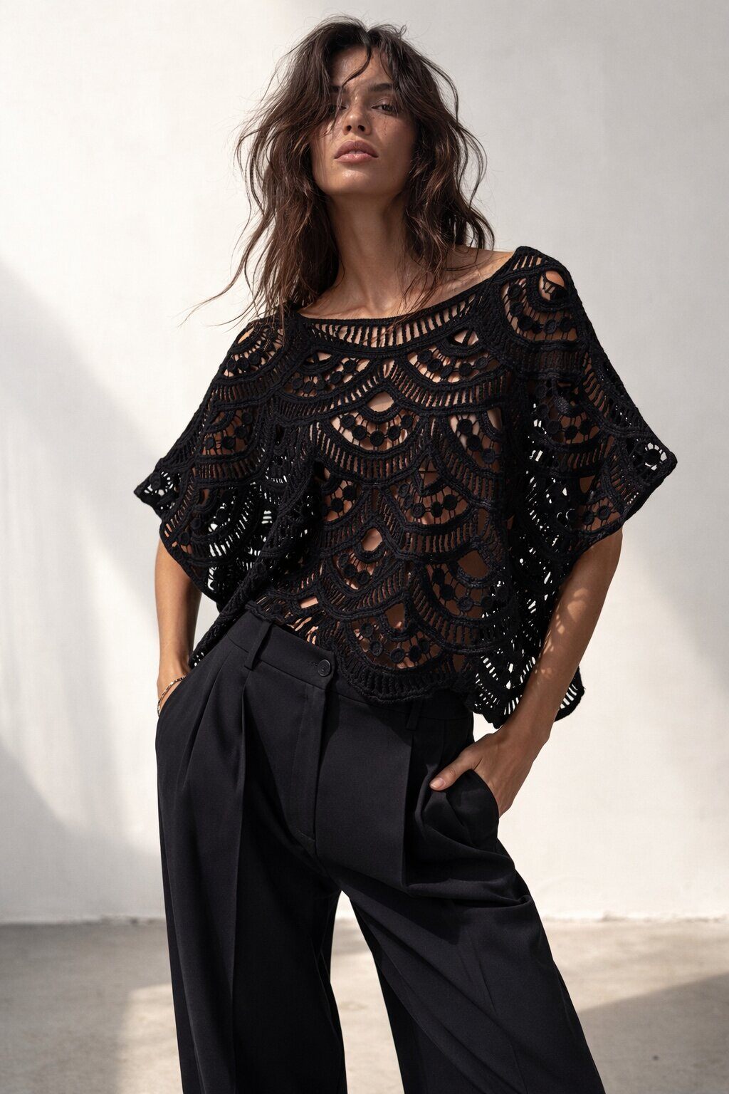 Deze prachtige gehaakte top is een echte zomerse eyecatcher. Het opengewerkte crochetpatroon geeft een speelse, vrouwelijke look en maakt de top heerlijk luchtig op warme dagen. Dankzij de losse, soepel vallende pasvorm draag je hem moeiteloos van casual tot chic.