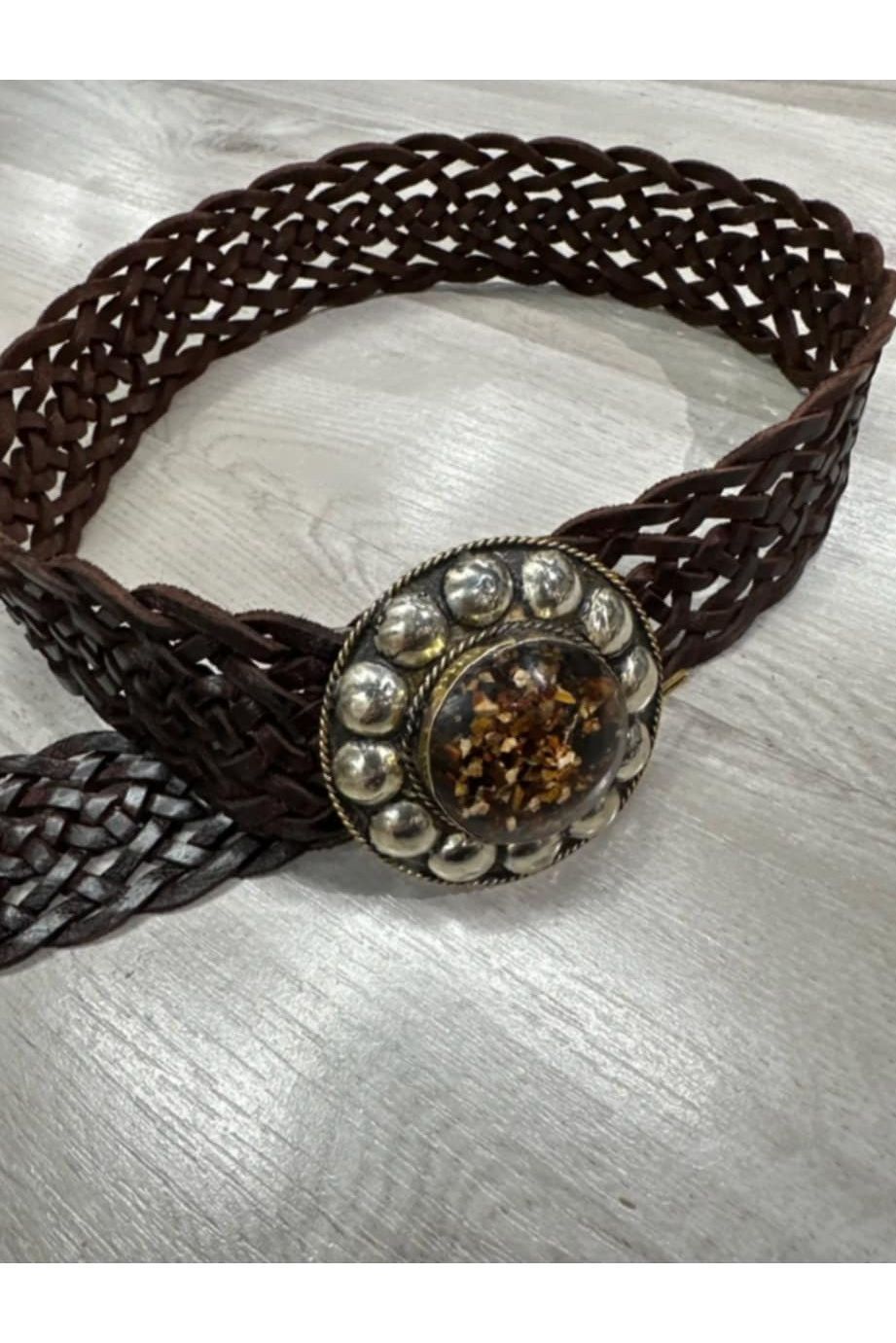 Maak van je outfit een blikvanger met deze unieke donkerbruin gevlochten riem. De brede band (4-5 cm) is vervaardigd uit stevig materiaal en heeft een verfijnd vlechtwerk dat zorgt voor een bohemian en toch stoere uitstraling. De grote ronde gesp is afgewerkt met zilverkleurige details en een opvallend resin-middelpunt met amberkleurige accenten – een echte eyecatcher.