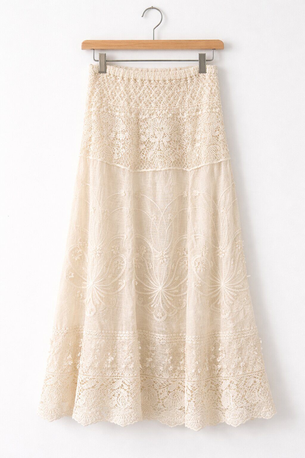 Romantisch en verfijnd, deze lange ecru kanten rok is een tijdloos charmant kledingstuk. Gemaakt van een lichte stof en versierd met bloemenborduurwerk en ingewikkelde kanten details, voegt hij een delicate en vrouwelijke touch toe aan elke outfit.
