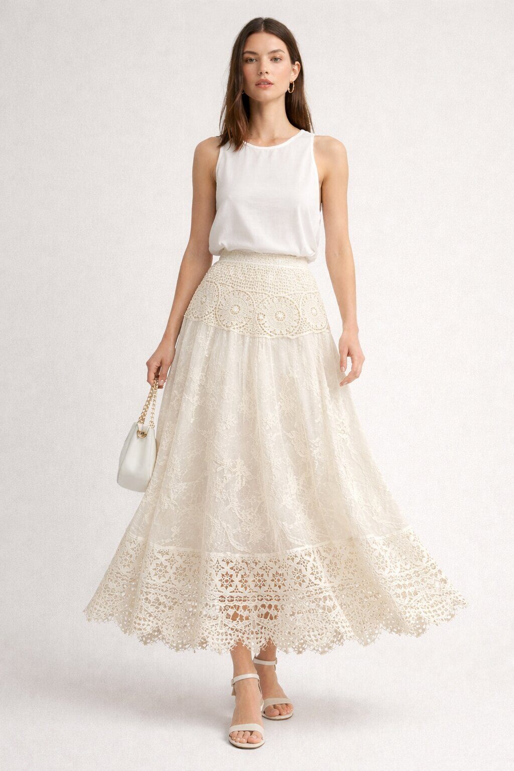 Een midi-rok van katoen en geborduurd kant, versierd met decoratieve banden met haakmotieven en bloemeninzetten.