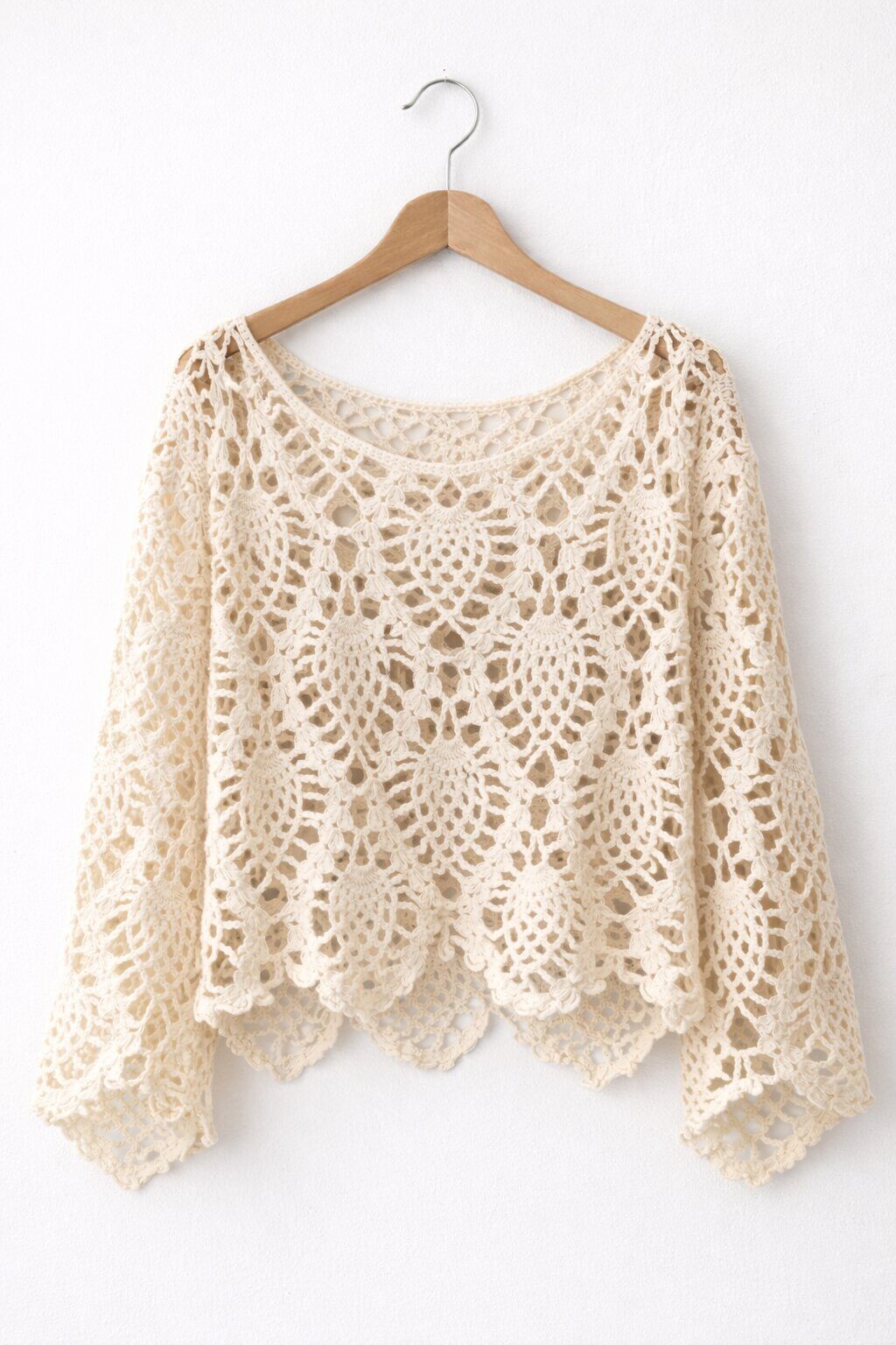 Een visueel aantrekkelijke gehaakte top met opengewerkte sierpatronen en een eigentijdse, korte snit.