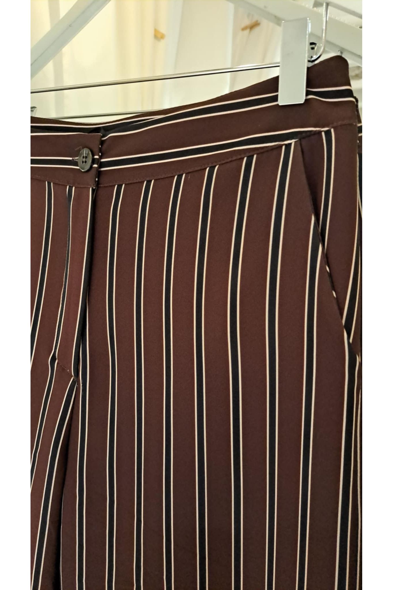 Classy met een knipoog! Deze chocoladebruine pantalon met zwart-ecru streepjesprint is een echte blikvanger voor de herfst/wintercollectie. De soepele stof valt mooi recht, met een flatterende, lichte flare. Dankzij de steekzakken, knoop- en ritssluiting oogt ze verzorgd én comfortabel tegelijk.
