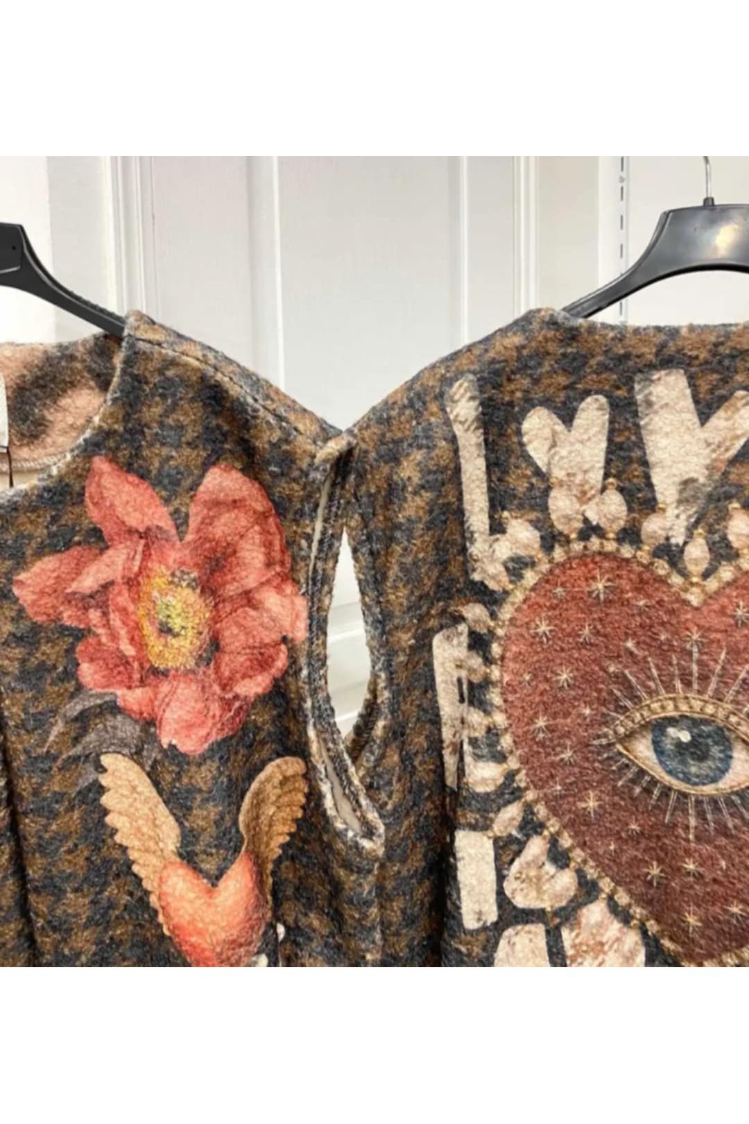 Een gilet dat liefde uitstraalt in elke draad. De symbolische prints van zon, maan, hart en bloem brengen een vleugje spiritual boho in je look — alsof je een verhaal draagt vol licht, vrijheid en verbinding. De zachte wolachtige textuur geeft het stuk een cosy maar karaktervolle feel.
