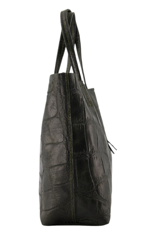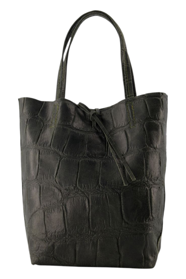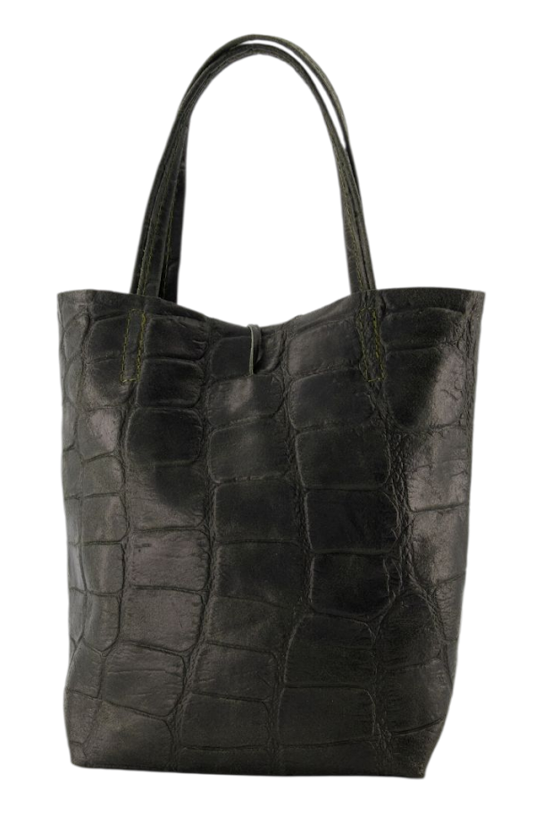 De Alice leren mini shopper vervaardig van suede in een crocouitvoering heeft een touwsluiting en komt met een afneembaar en verstelbaar lang hengsel om ook als crossbodytas te kunnen dragen.