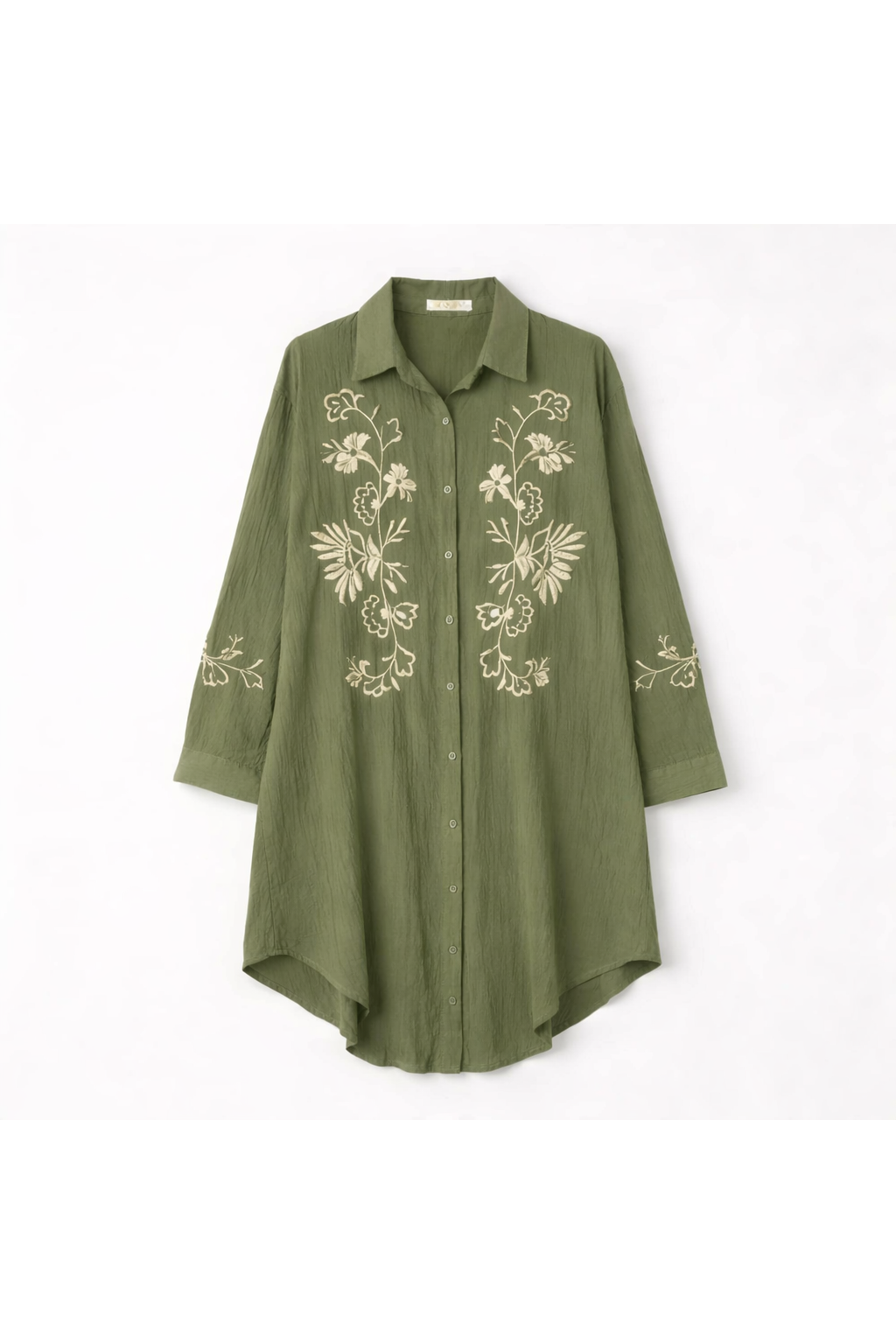 Een luchtige hemdjurk in 100% katoen, afgewerkt met verfijnd borduurwerk in een zachte crèmekleur.