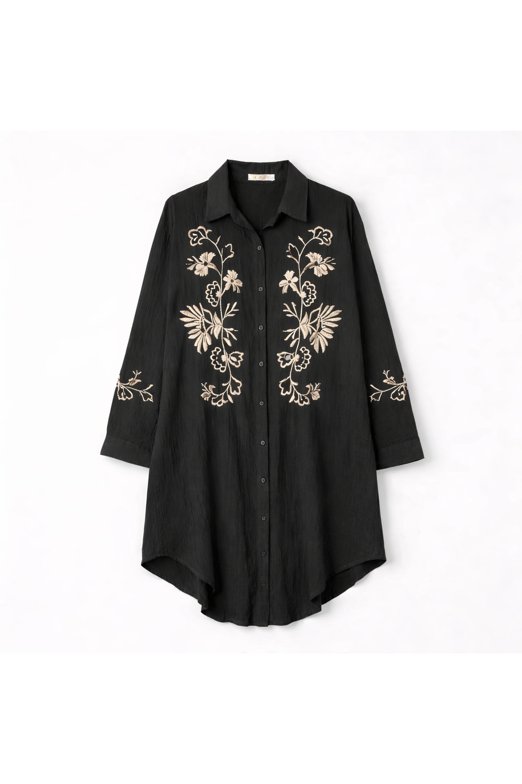 Een luchtige hemdjurk in 100% katoen, afgewerkt met verfijnd borduurwerk in een zachte crèmekleur.