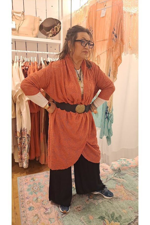 De soepelvallende waterfall hals creëert een zachte V-lijn en valt elegant over de borst zonder te spannen. De snit is los en comfortabel, maar kan perfect getailleerd worden met een riem voor een meer uitgesproken silhouet.