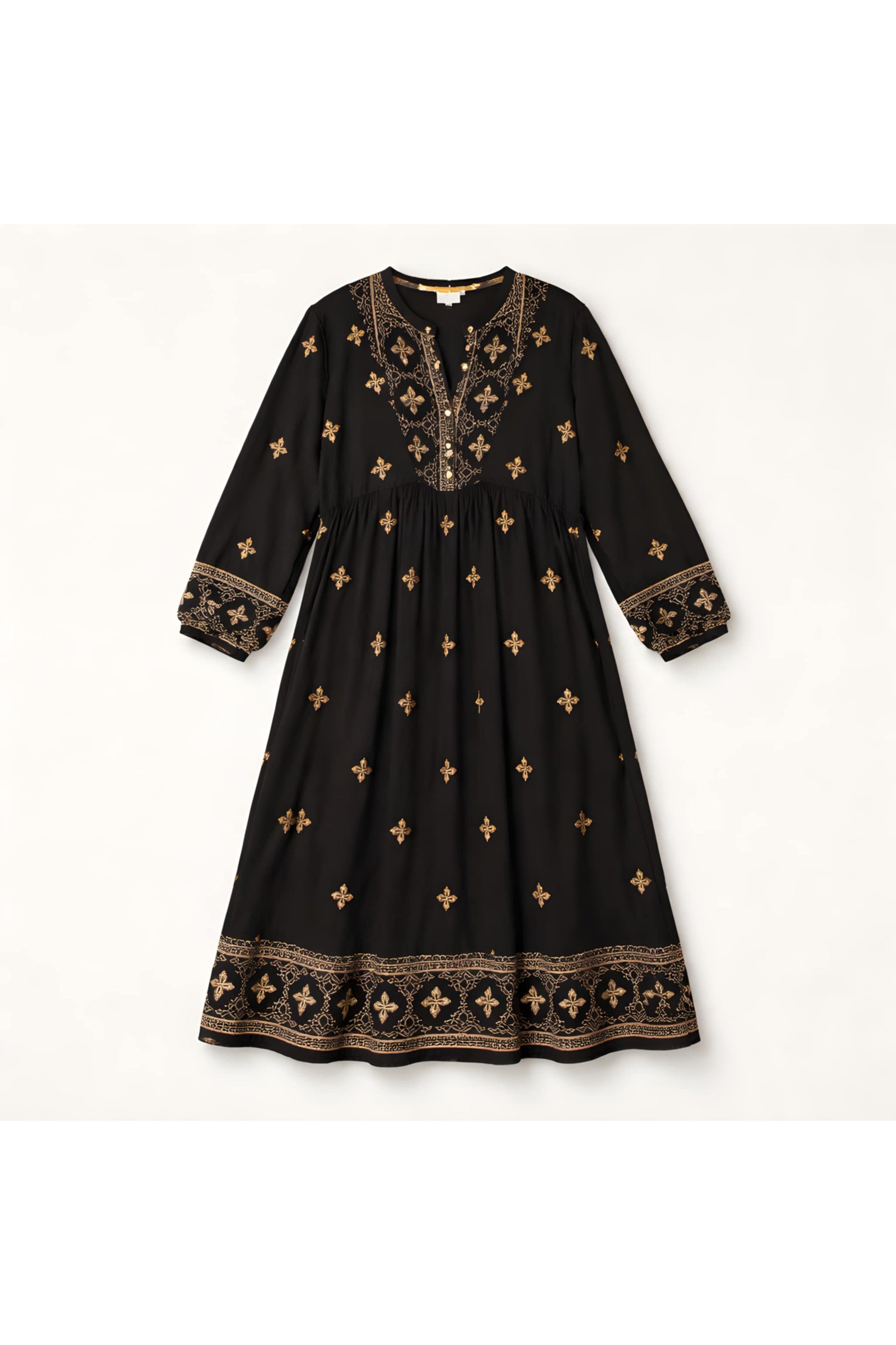 De zwarte kleur geeft haar rust en klasse, terwijl het verfijnde crèmekleurige borduurwerk aan de borst, mouwen en zoom zorgt voor een subtiel bohemian accent. De V-hals met knoopdetail en de licht getailleerde snit onder de borst flatteren zonder strak te zitten.