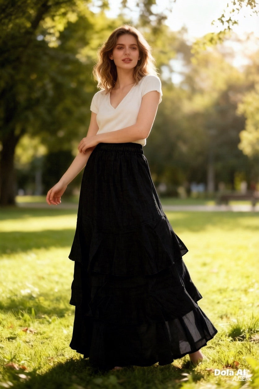 De drie speelse lagen ruches zorgen voor beweging en een zachte, bohemian vibe zonder zwaar te vallen. Dankzij de elastische tailleband zit ze comfortabel en flatteert ze mooi rond de taille. Combineer met een simpele top, een knit of een cropped blouse en je bent klaar – van city stroll tot zomerfeest.