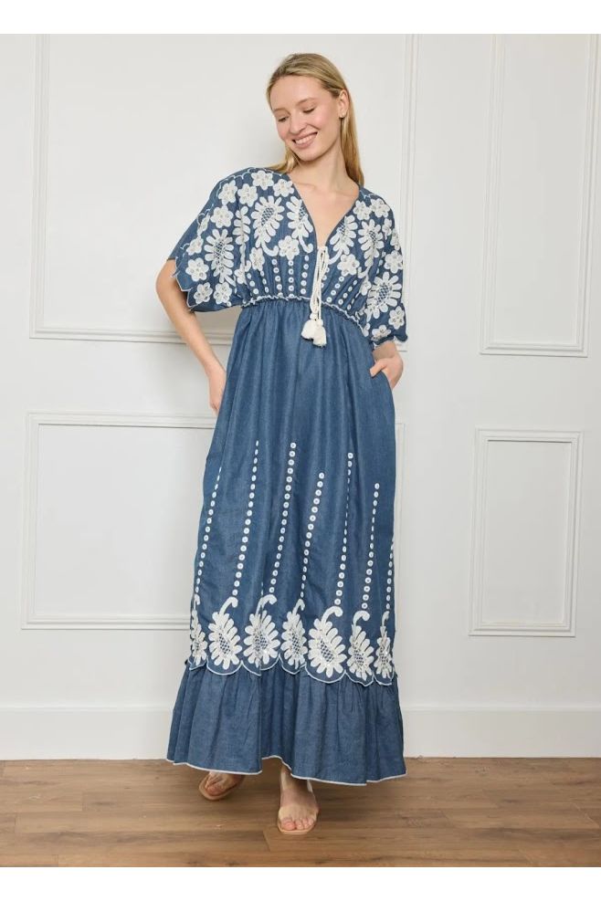 Deze maxi jurk is een echte boho beauty! De denimblauwe kleur in combinatie met het rijke witte borduurwerk en subtiele pareldetails maakt haar super vrouwelijk en uniek. De jurk heeft een flatterende V-hals met striklintjes en een mooie taille-afwerking waardoor ze elegant valt, maar nog altijd heerlijk comfortabel zit.