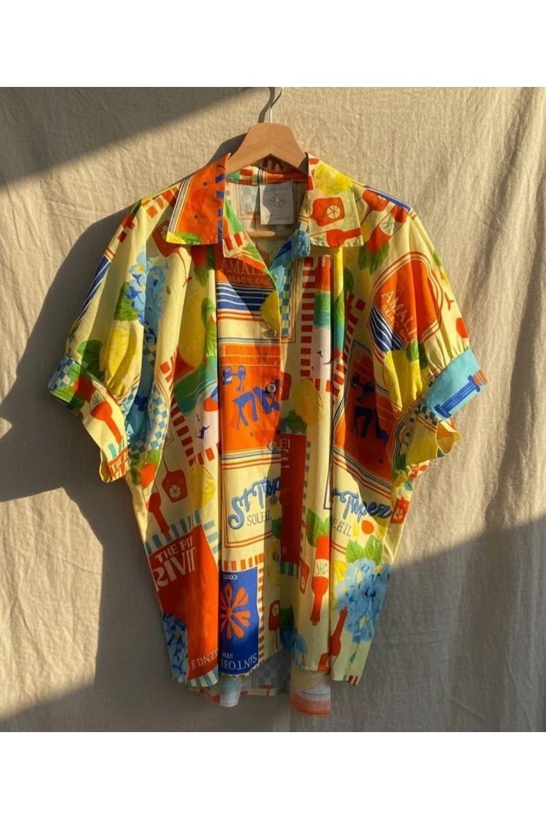 Deze maxi bloes ademt zon, vakantie en een tikkeltje Italiaanse flair. De kleurrijke all-over print met citrus, grafische elementen en zomerse vibes maakt van dit stuk een echte eyecatcher.