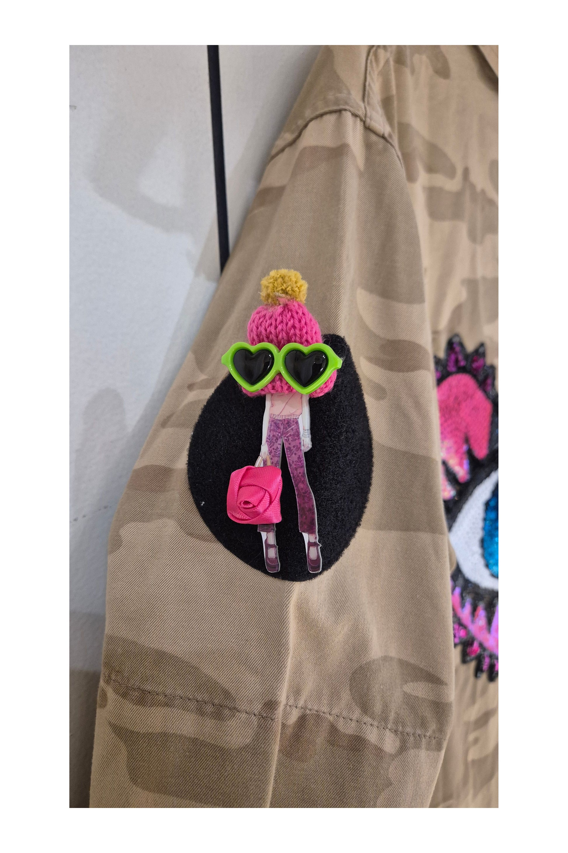Op de mouw zit een speelse pop-achtige broche met een roze mutsje, hartvormige zonnebril en mini-handtas — een knipoog naar fun & fashion in één.