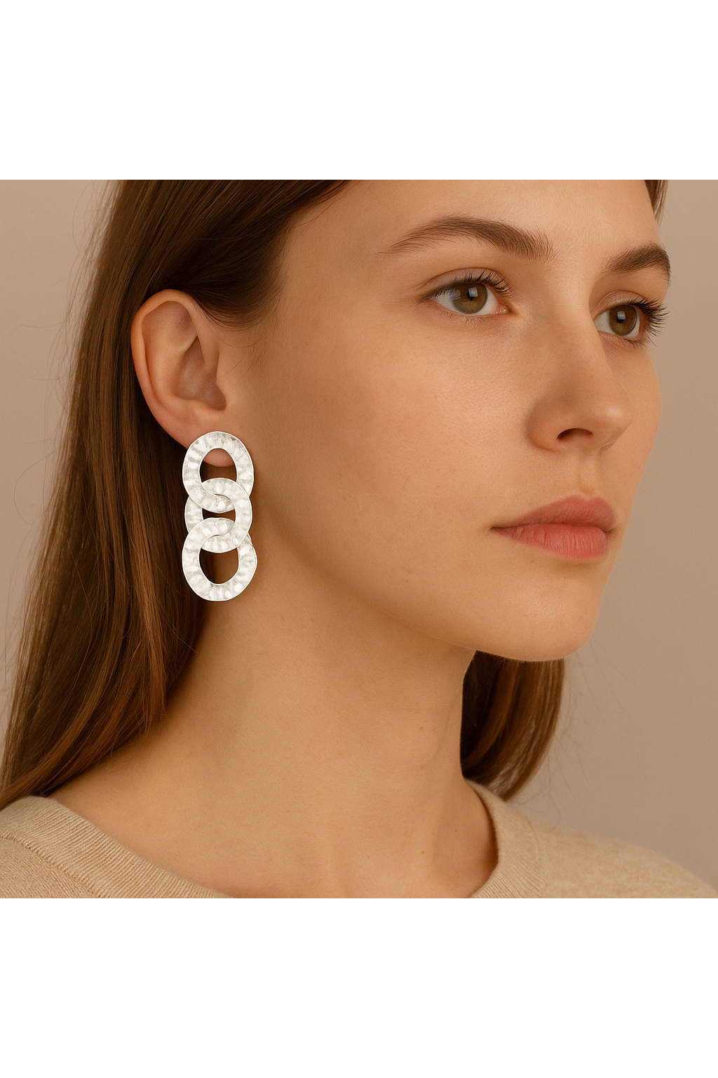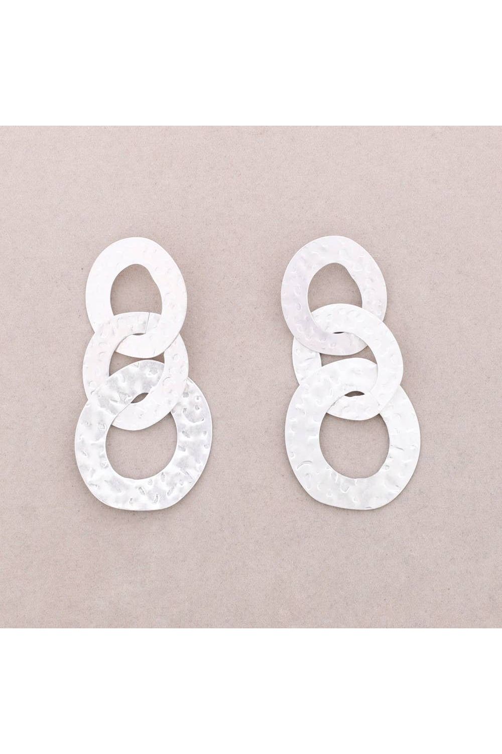 Maak een stijlvol statement met deze elegante oorbellen in stainless steel. Het ontwerp bestaat uit drie speelse gehamerde ringen die subtiel in elkaar overlopen en zo een chique maar eigentijdse uitstraling geven. De zilverkleurige afwerking voegt een verfijnde glans toe, perfect voor zowel een casual outfit als een feestelijke look.