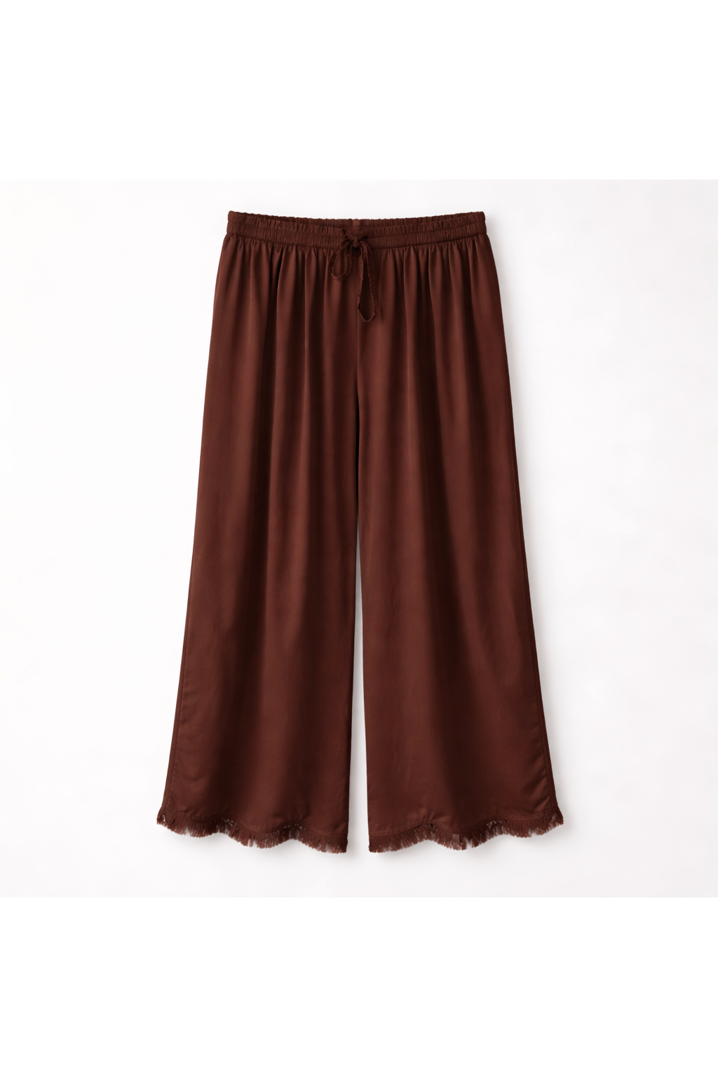 Deze satijnen broek is het perfecte huwelijk tussen comfort en elegantie. De soepelvallende mix van viscose en zijde geeft haar die zachte glans en luchtige feel waar je instant verliefd op wordt. De franjes onderaan zorgen voor een speelse, bohemian touch die net dat tikkeltje extra geeft.