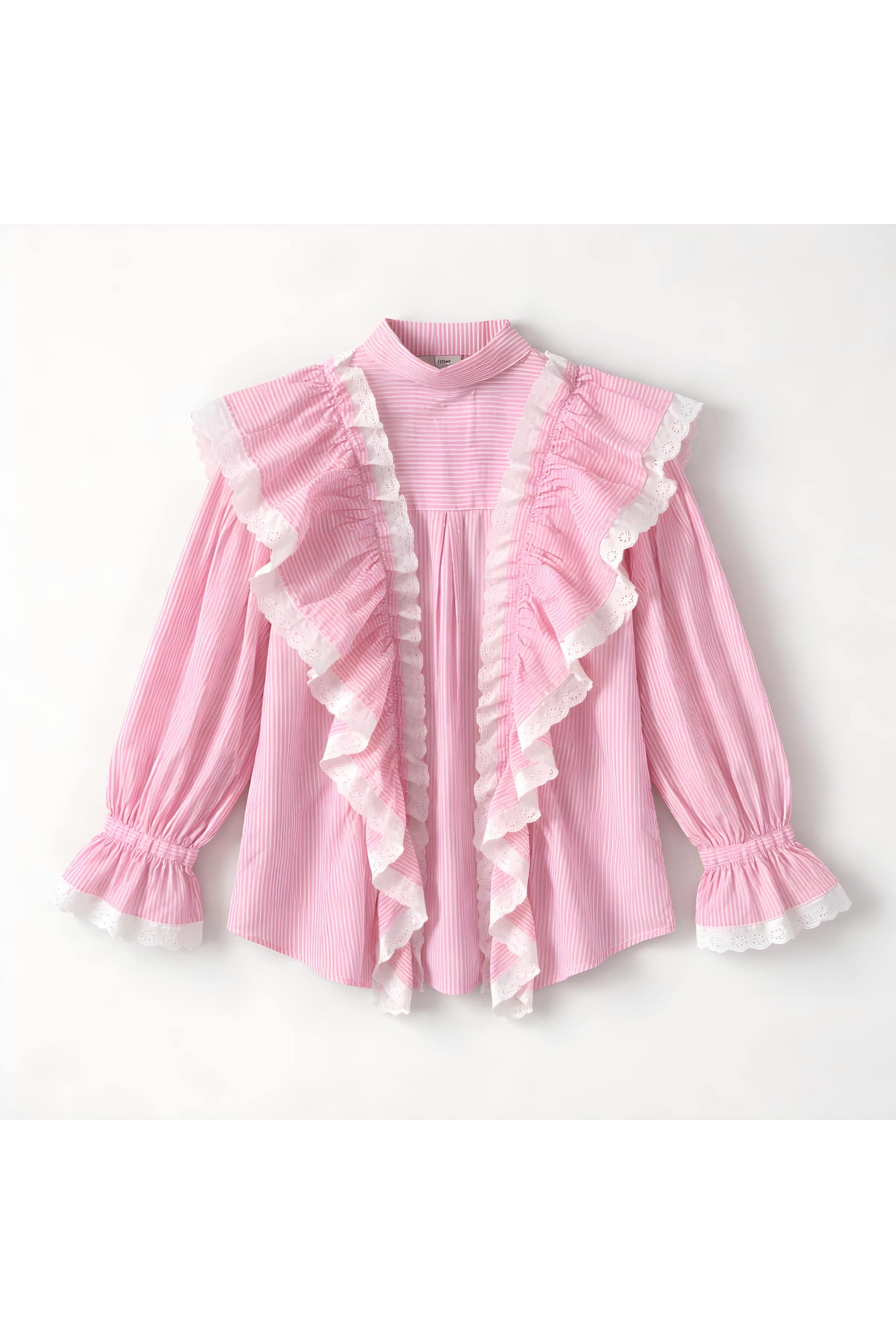 Deze gestreepte katoenen bloes is een echte romantische eyecatcher. De fijne streep krijgt extra charme door de broderie anglaise en speelse ruffles die niet alleen aan de voorzijde lopen, maar ook mooi doorlopen op de rugzijde – een detail dat haar nét dat tikkeltje specialer maakt.