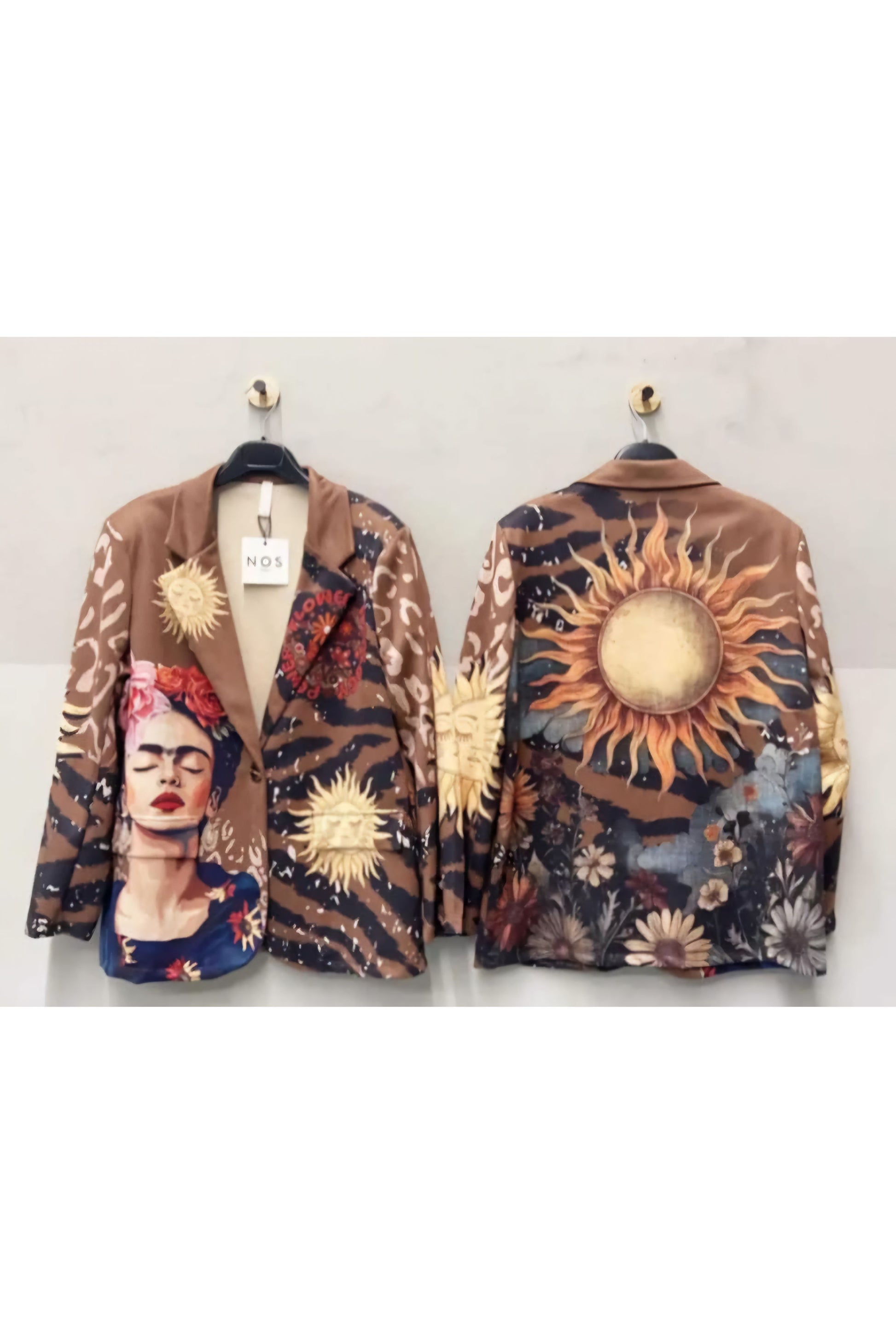Deze blazer is pure poetry in kledingvorm. Een mix van warme bruintinten, tijgerprint-accenten en krachtige artistieke elementen maakt dit een statement piece dat je nergens anders vindt. De voorkant toont een indrukwekkende muzen-portrait met bloemen en zachte zonmotieven; de achterkant wordt gedomineerd door een grote, vurige zon omringd door een bloemenveld.