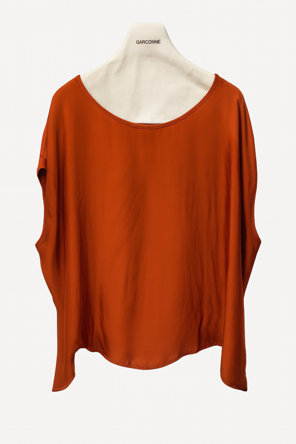 Deze losvallende top in een zachte zijdeglans voelt als een zomerse bries op je huid. Het model heeft elegante, aangesneden vleermuismouwen die nonchalant over de schouder vallen en een flatterende, vrouwelijke lijn creëren.