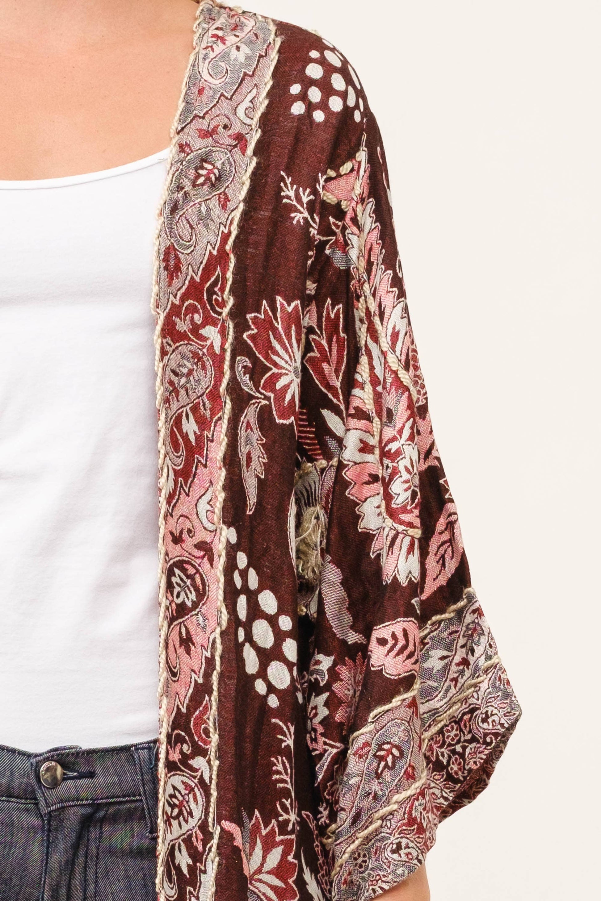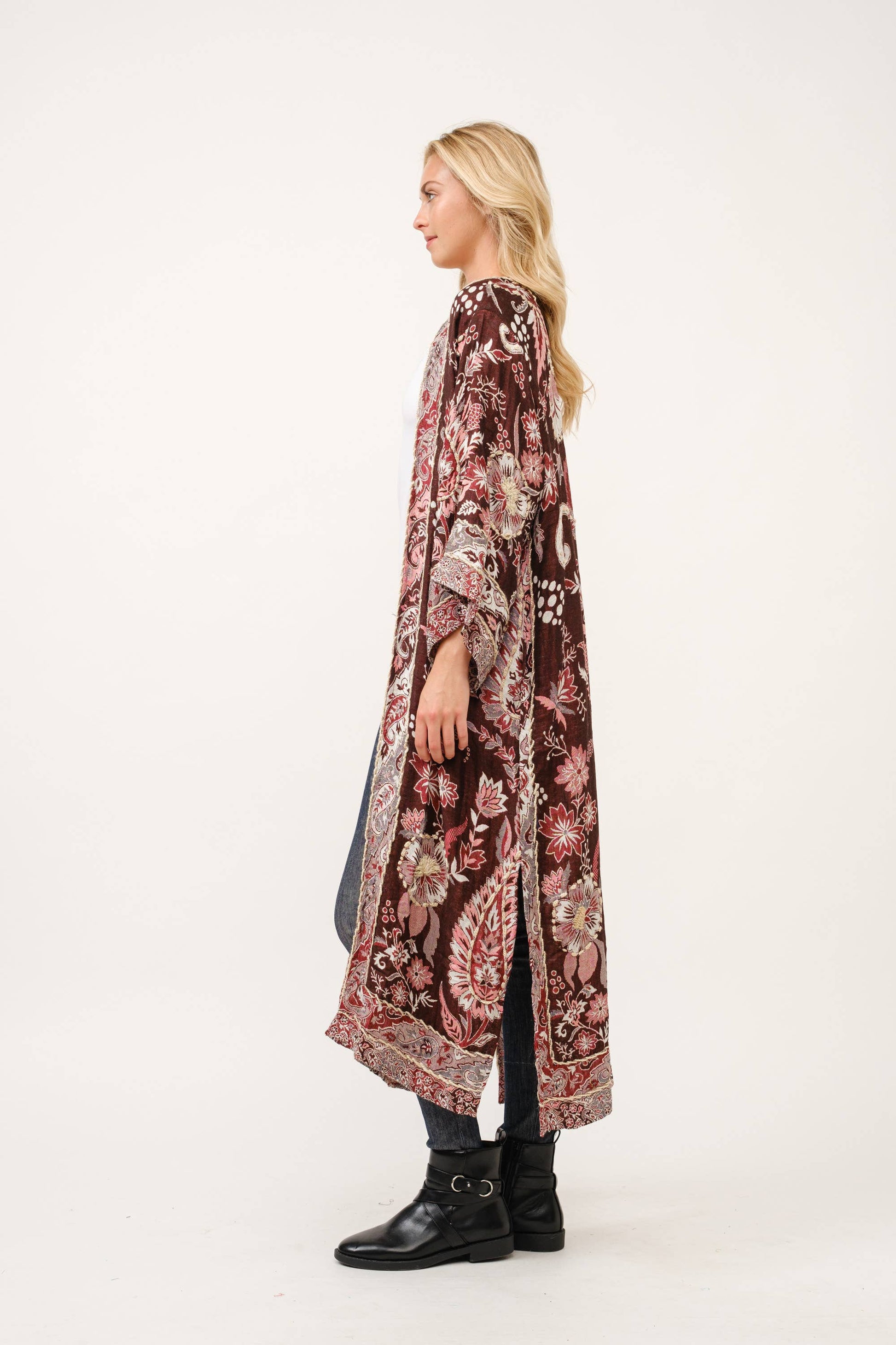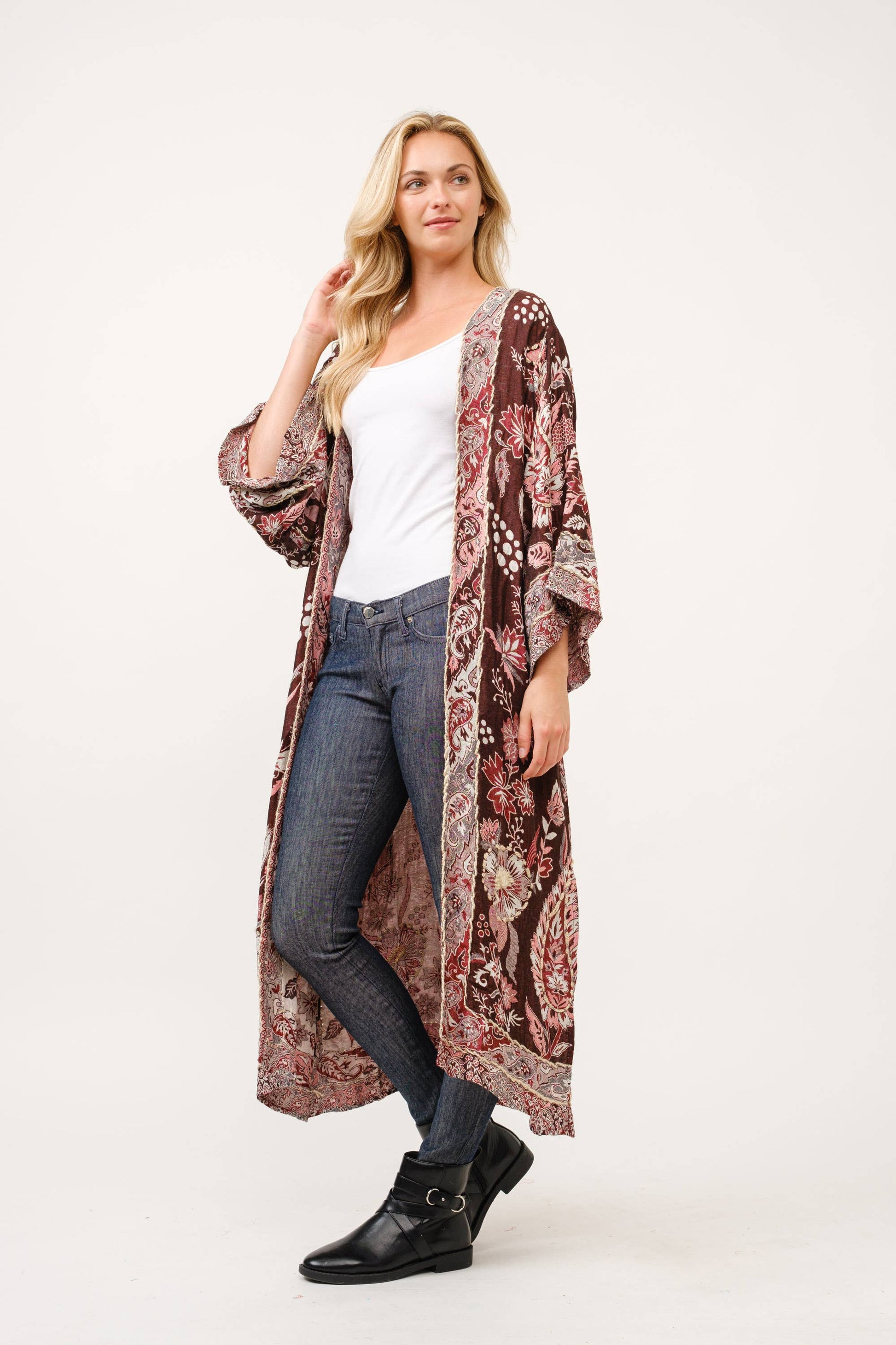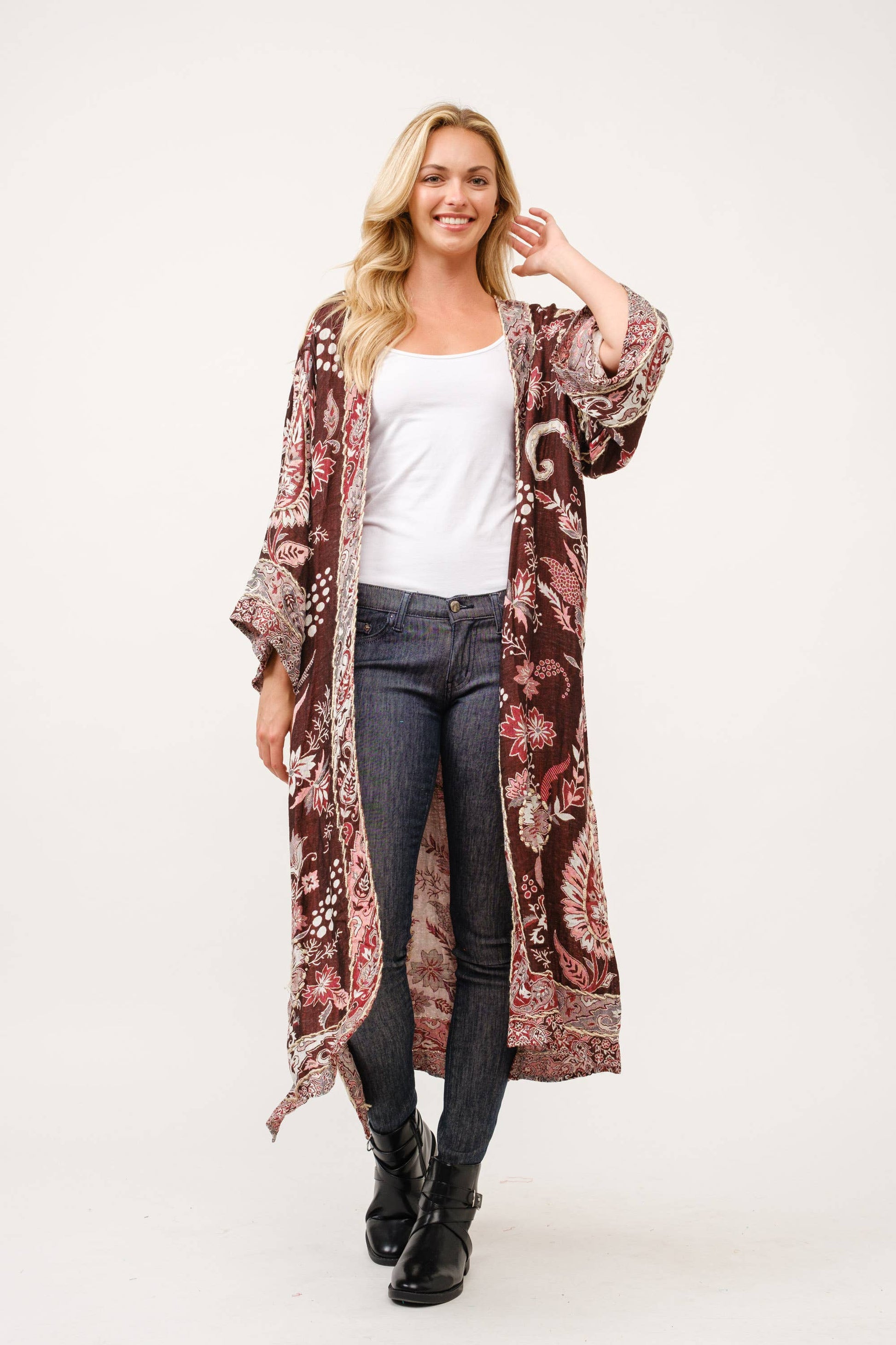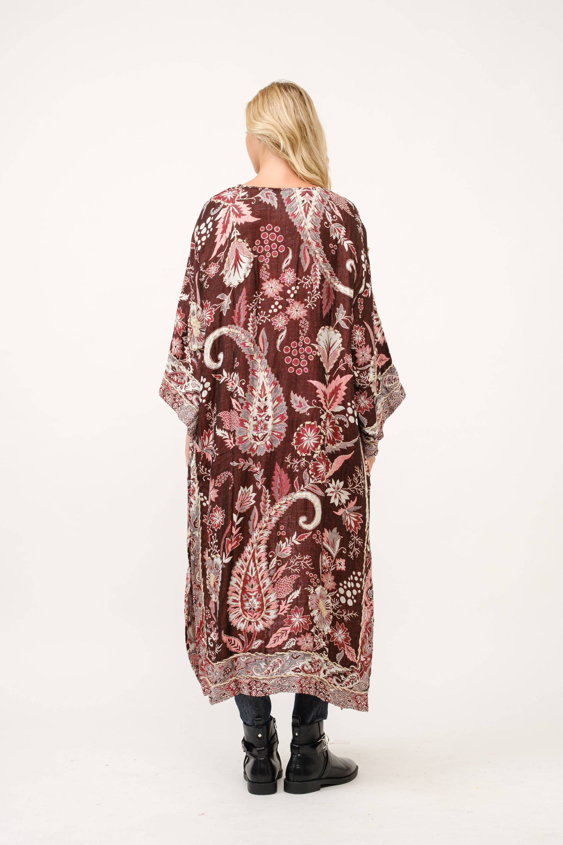 Vega Duster is echt een prachtig statement-item dat elke garderobe naar een hoger niveau tilt. De ingewikkelde bloemen- en paisleyprints, gecombineerd met delicate borduursels, stralen elegantie en verfijning uit. Deze veelzijdige kimono voegt een vleugje Boheemse glamour toe, perfect om in laagjes te dragen en een artistieke flair toe te voegen aan zowel casual als formele outfits. Of het nu over een eenvoudig ensemble is gedrapeerd of gestyled is met opvallende accessoires, de Vega Duster is een showstopper die je look moeiteloos transformeert met charme. Kleine variaties in het borduurwerk zijn kenmerkend voor handborduurwerk en mogen niet als defect worden beschouwd.