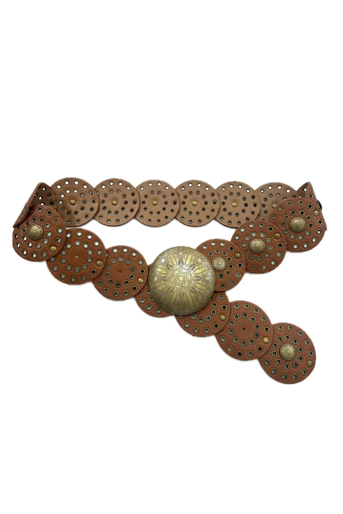 Deze stoere camel riem in nepleer tilt je outfit direct naar een hoger niveau. De riem is opgebouwd uit ronde schijven, rijkelijk versierd met metalen studs en ringen, wat zorgt voor een uitgesproken bohemian-western vibe. De grote ronde gesp in antiek goudkleur vormt het stralende middelpunt en maakt dit accessoire tot een echte statement piece.