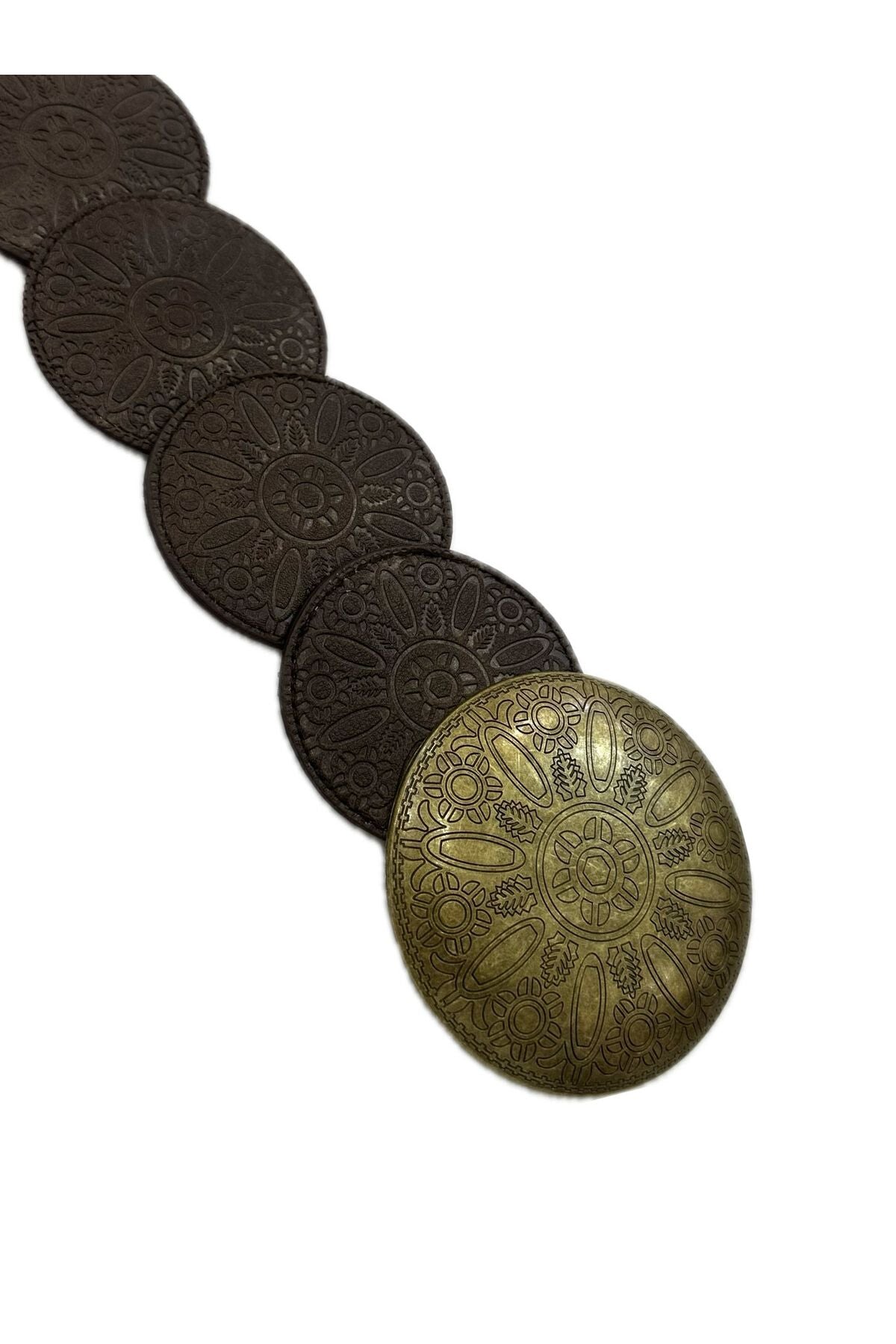 Deze opvallende riem in donkerbruin nepleer geeft elke outfit een vleugje bohemian westernstijl. De riem bestaat uit ronde, reliëf-gedecoreerde schijven die samen een uniek en stoer design vormen. De grote ronde gesp in antiek goudkleur steelt de show en maakt dit accessoire tot een echte eyecatcher.