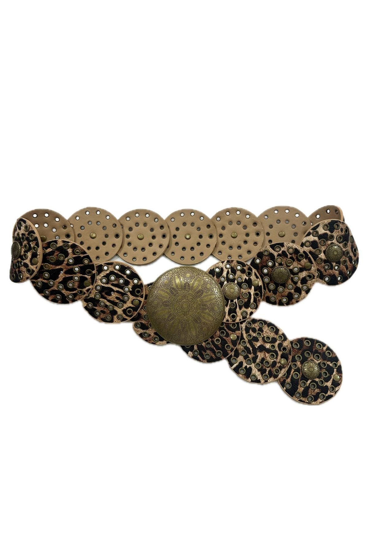 Deze stoere léopard print riem in nepleer tilt je outfit direct naar een hoger niveau. De riem is opgebouwd uit ronde schijven, rijkelijk versierd met metalen studs en ringen, wat zorgt voor een uitgesproken bohemian-western vibe. De grote ronde gesp in antiek goudkleur vormt het stralende middelpunt en maakt dit accessoire tot een echte statement piece.