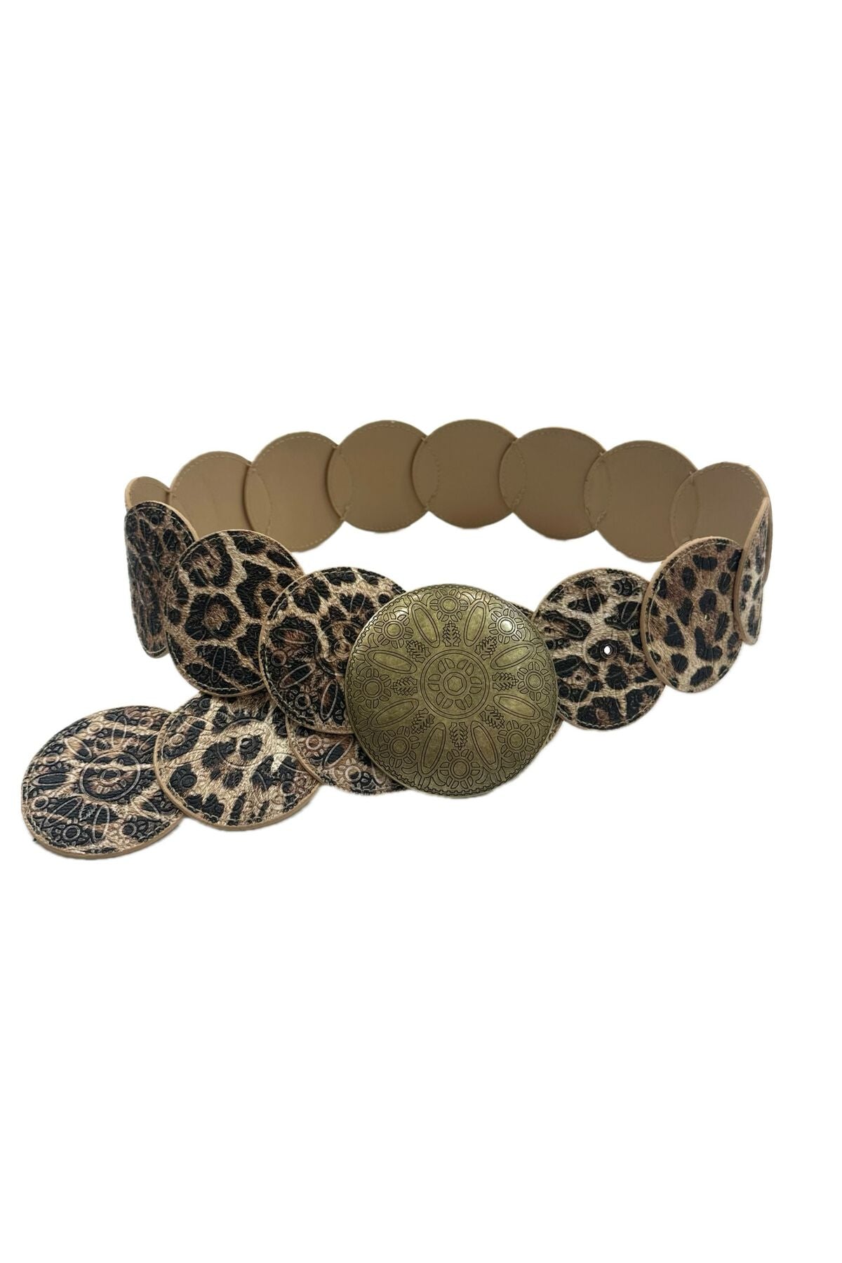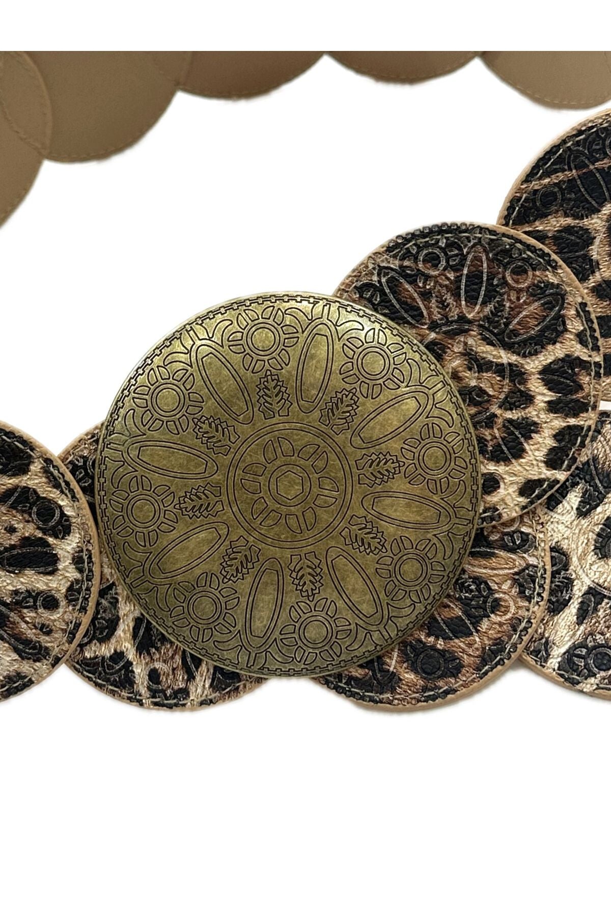 Deze opvallende riem in léopard nepleer geeft elke outfit een vleugje bohemian westernstijl. De riem bestaat uit ronde, reliëf-gedecoreerde schijven die samen een uniek en stoer design vormen. De grote ronde gesp in antiek goudkleur steelt de show en maakt dit accessoire tot een echte eyecatcher.