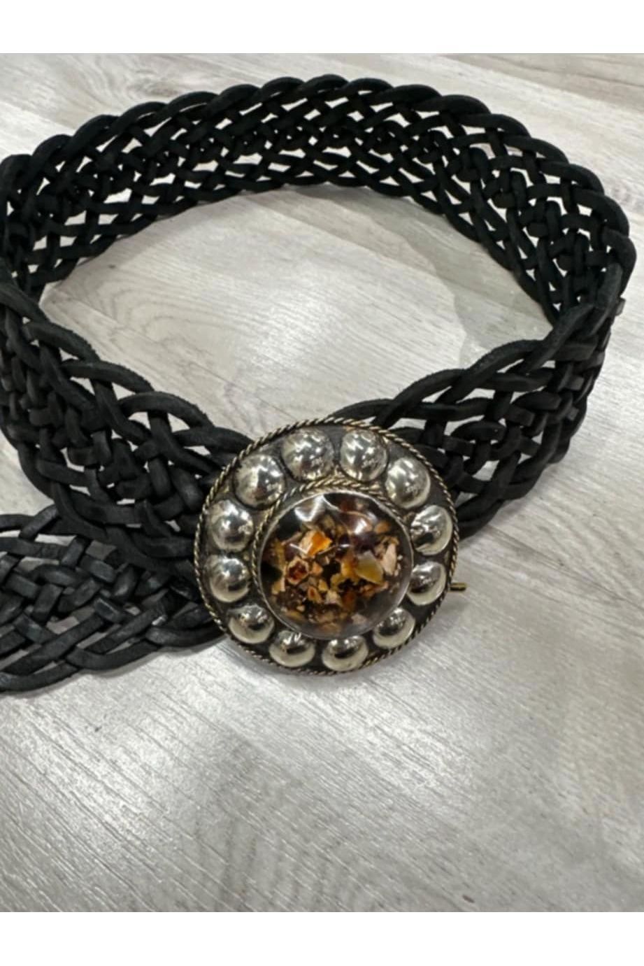 Maak van je outfit een blikvanger met deze unieke zwarte gevlochten riem. De brede band (4-5 cm) is vervaardigd uit stevig materiaal en heeft een verfijnd vlechtwerk dat zorgt voor een bohemian en toch stoere uitstraling. De grote ronde gesp is afgewerkt met zilverkleurige details en een opvallend resin-middelpunt met amberkleurige accenten – een echte eyecatcher.